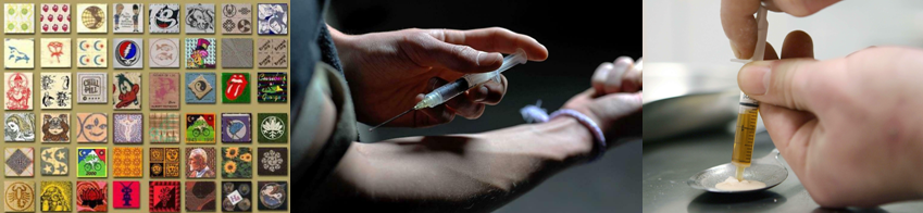 als Lösung (LSD) auf Löschpapierchen oder Würfelzucker mit Comicaufdruck geträufelt. Es sind typische Partydrogen